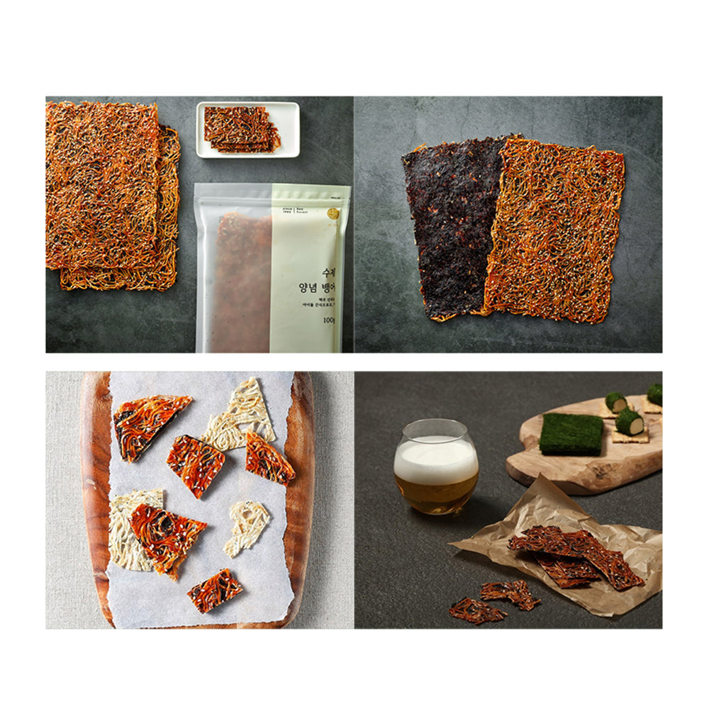 찹쌀고추장 양념을 발라 구운 후 김을 덧붙였어요. 매콤하면서 달짝지근하고, 고소하면서 짭잘한 양념 뱅어의 맛을 적당히 표현할 만한 형용사를 찾기도 어려울 지경이네요. 자극적인 향이나 맛이 있는 것도 아닌데 묘한 밸런스가 있고요. 그래서 한 번 그 맛을 느끼면 계속 찾게 되는 간식이예요. 살짝 얼려 먹으면 바삭한 식감까지 더해져 정말 맛이 좋아요. 마요네즈에 살짝 찍어 드시면 색다른 맛을 느낄 수 있습니다.