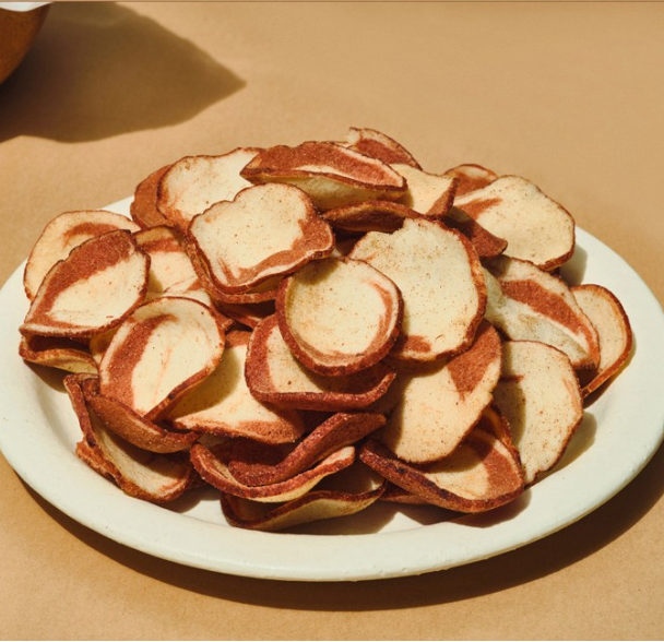 Cafe Mocha Chips with Cinnamon are made with real coffee powder for a rich cappuccino flavor, blended with sweet chocolate and warm cinnamon spice. The base is crafted from cassava and sweet potato, giving each chip a soft, cookie-like texture with a crispy bite. It’s a delicious balance of sweet, bold, and cozy flavors.