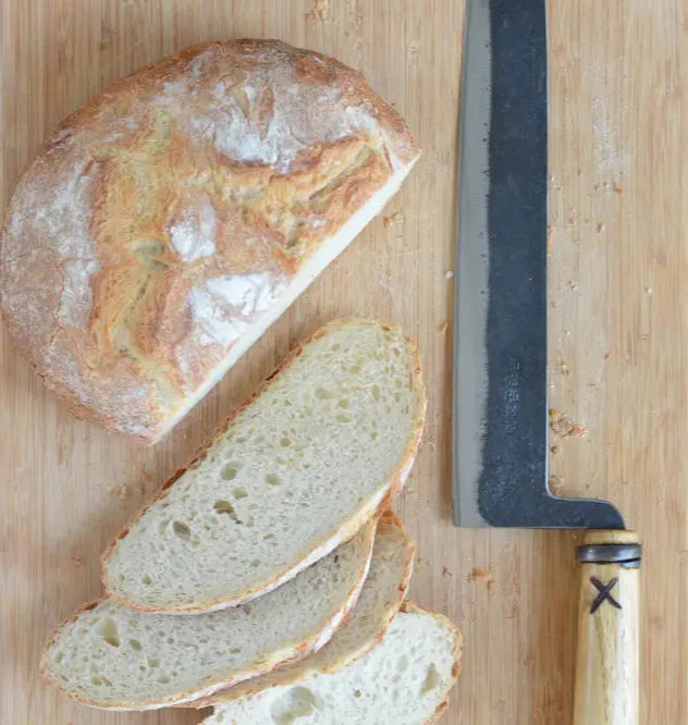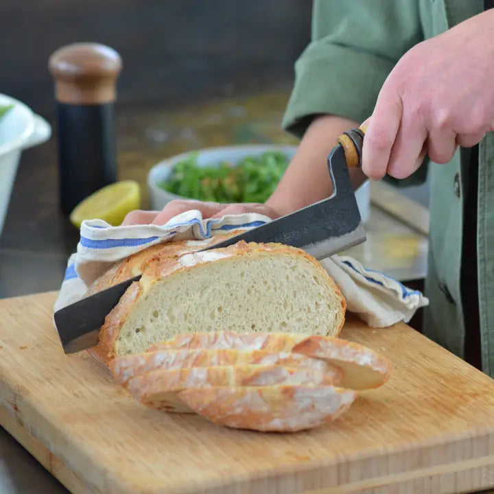 Unlike typical serrated bread knives, this blade is smooth—resulting in fewer crumbs and allowing the knife to be resharpened for extended use. Its patented, elevated handle design ensures the blade doesn’t touch the cutting board or table, keeping it clean and precise. This unique form requires more than 10 additional forging and shaping processes compared to standard knives, demonstrating the craftsmanship involved.