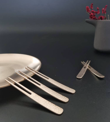 고유의 황금빛과 항균 효과로 사랑받는 유기. 조선유기공방의 포크 세트는 전통의 품격을 그대로 담아 모던한 식탁에 은은한 빛을 더해줍니다.