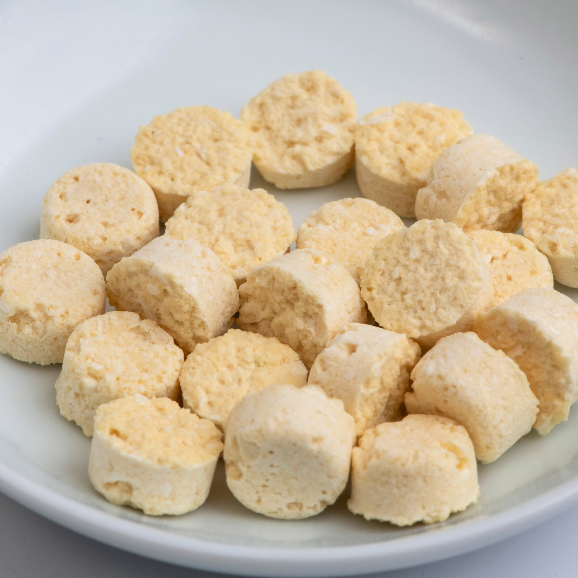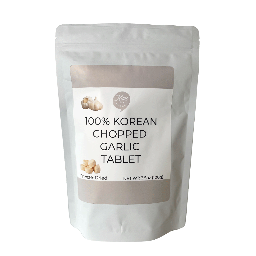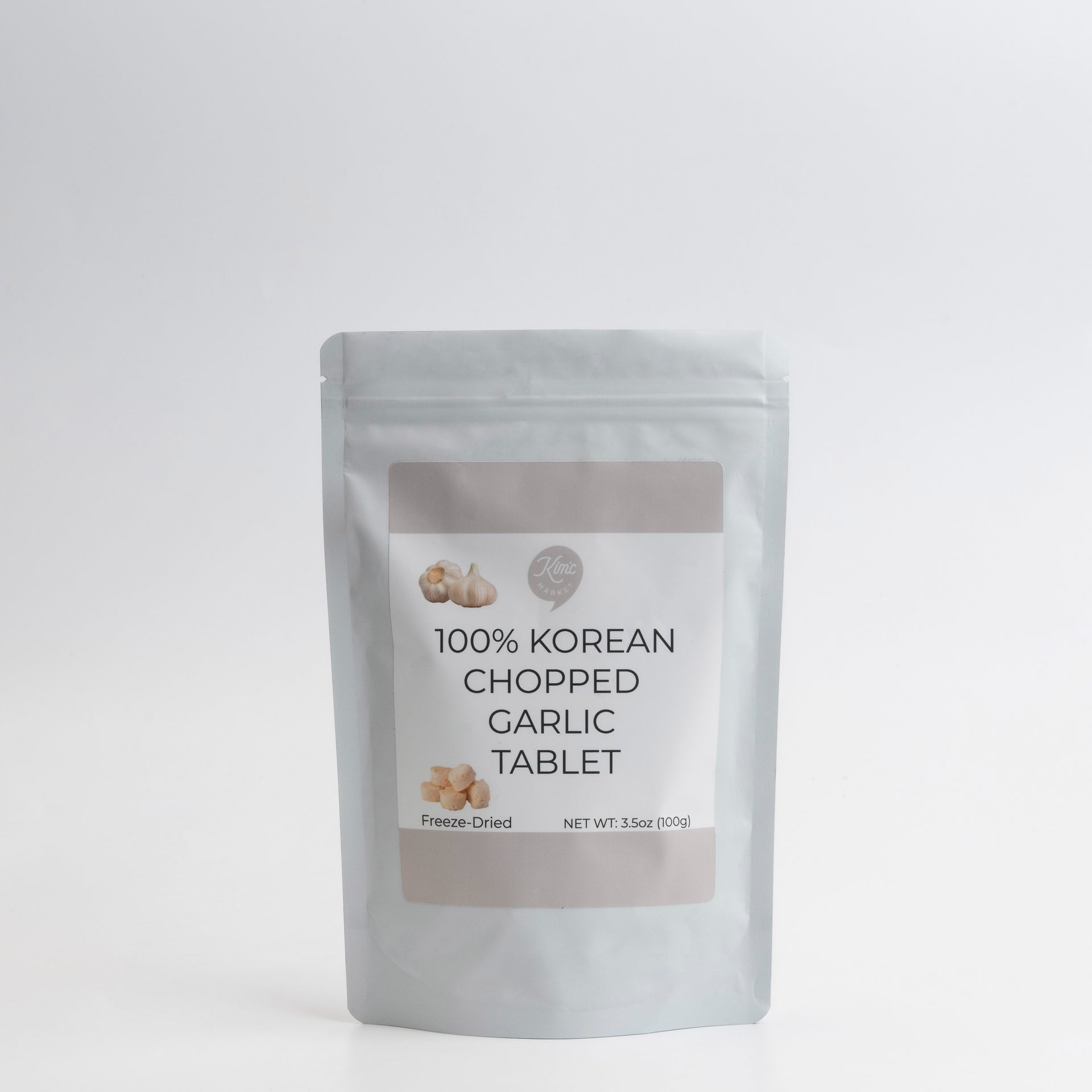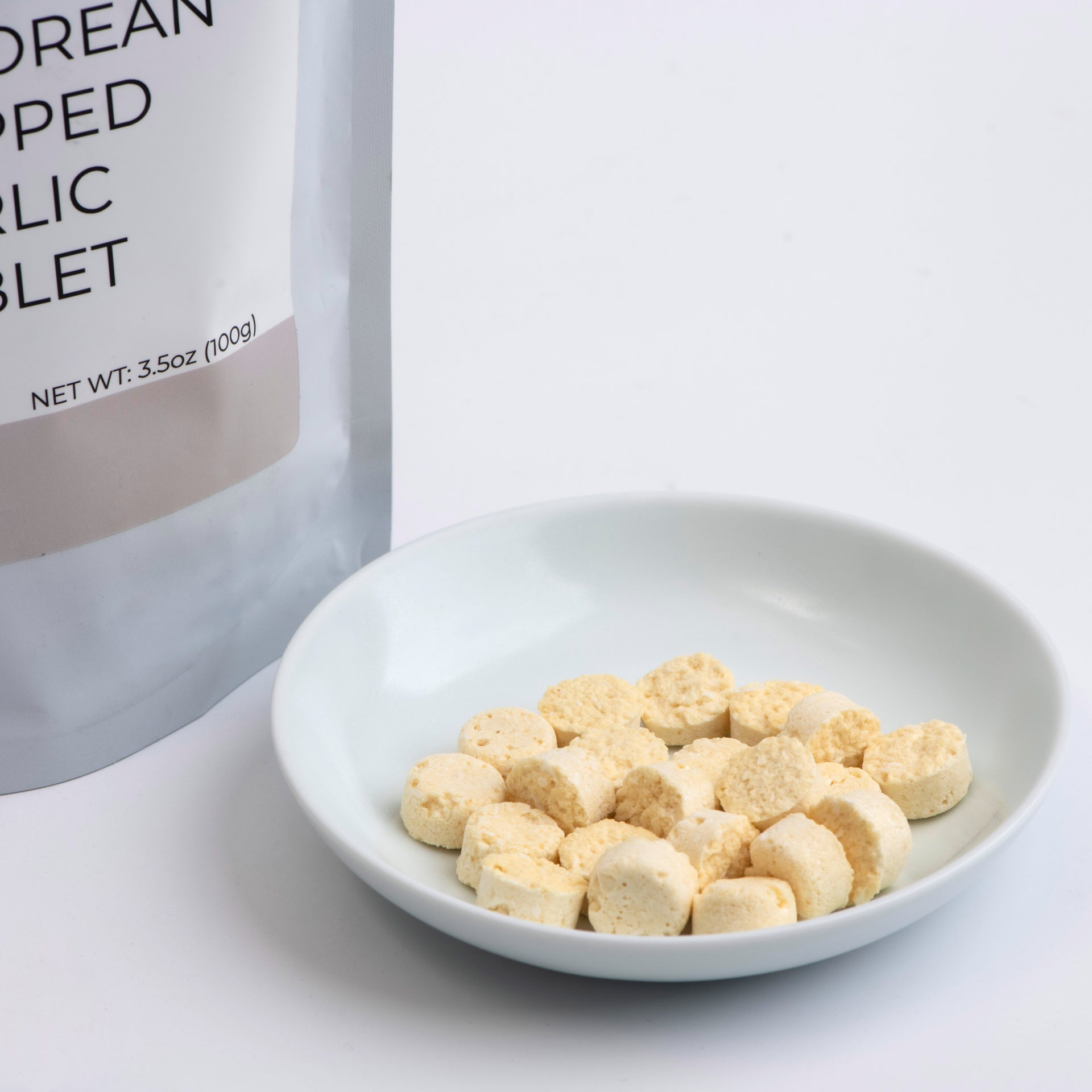 Meet One Tablet Chopped Garlic. Drop one spoon of water onto a tablet. Clean, freshly chopped garlic will be ready on your cooking station. It is freeze-dried and has no additives or chemicals. The garlic has its original flavor, color and taste of Korean garlic. When cooking soup, stew, seasoning fish or vegetables, you only need one or two tablets.